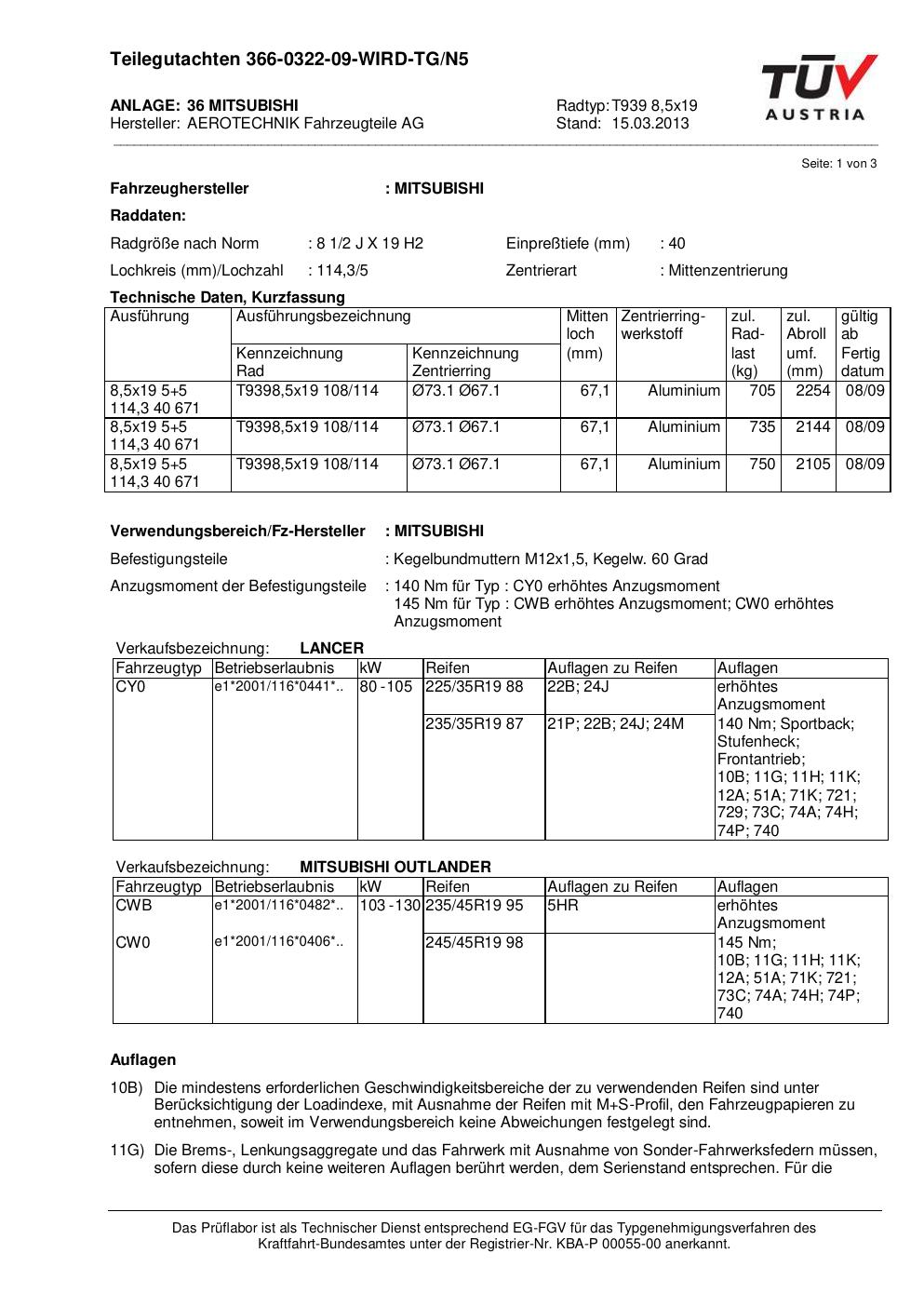 teilegutachten 366-0322-09 AEROTECHNIK T939 8,5x19