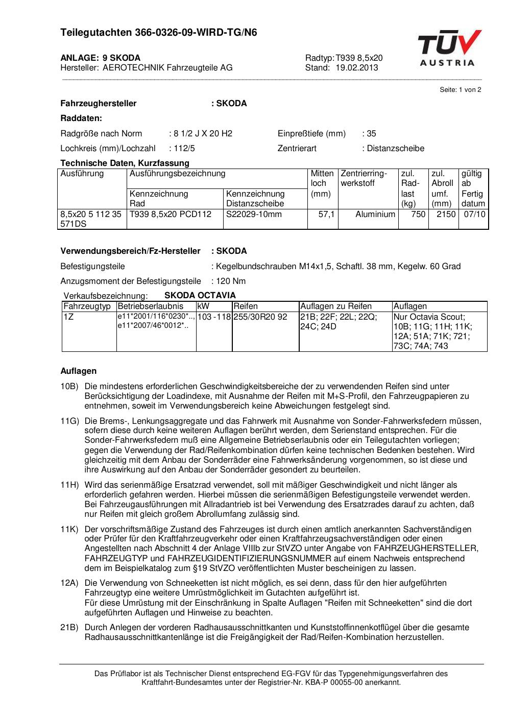 teilegutachten 366-0326-09 AEROTECHNIK T939 8,5x20