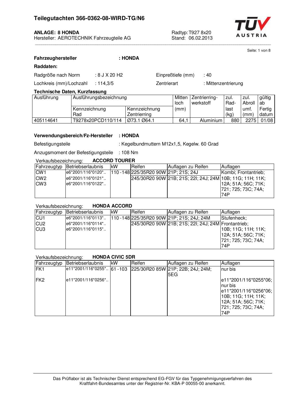 teilegutachten 366-0362-08 AEROTECHNIK T927 8x20