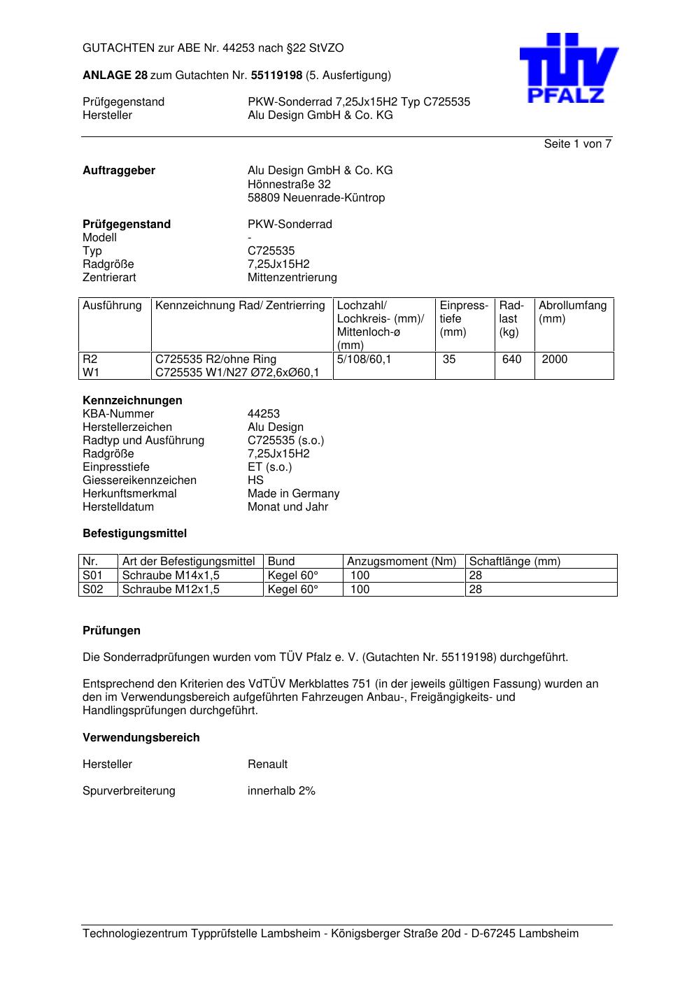 Dieses Gutachten (abe) bezieht sich auf die Alufelge AluDesign C725535 in der Ausführung ET 0, Mittenloch 0 mm (KBA 44253). Im PDF findest du typischerweise zulässige Reifengrößen, Auflagen/Anbauhinweise und – je nach Dokument – Hinweise zur Eintragung.