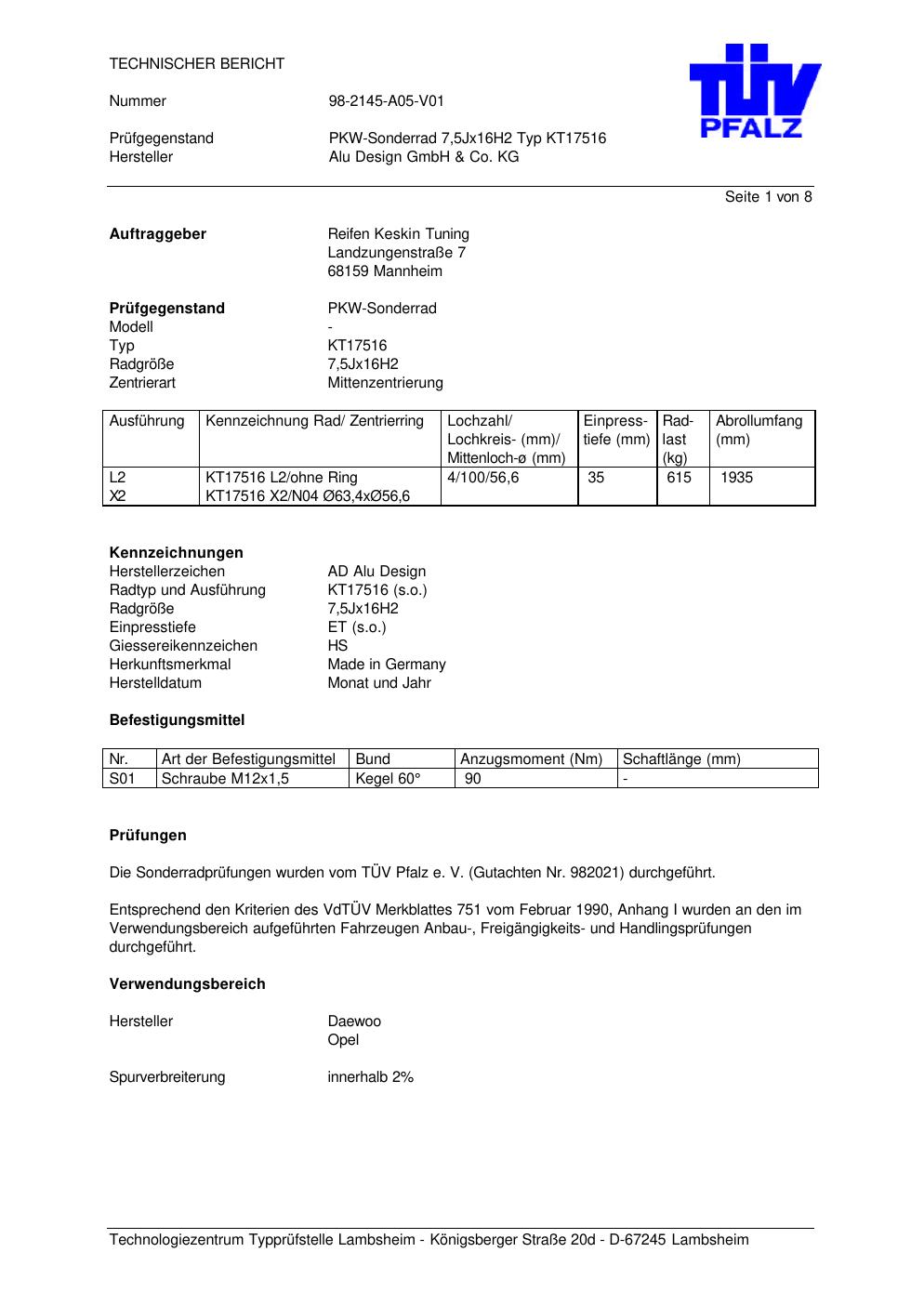 teilegutachten 98-2145-a05-v01 Alu Design GmbH & Co. KG KT17516