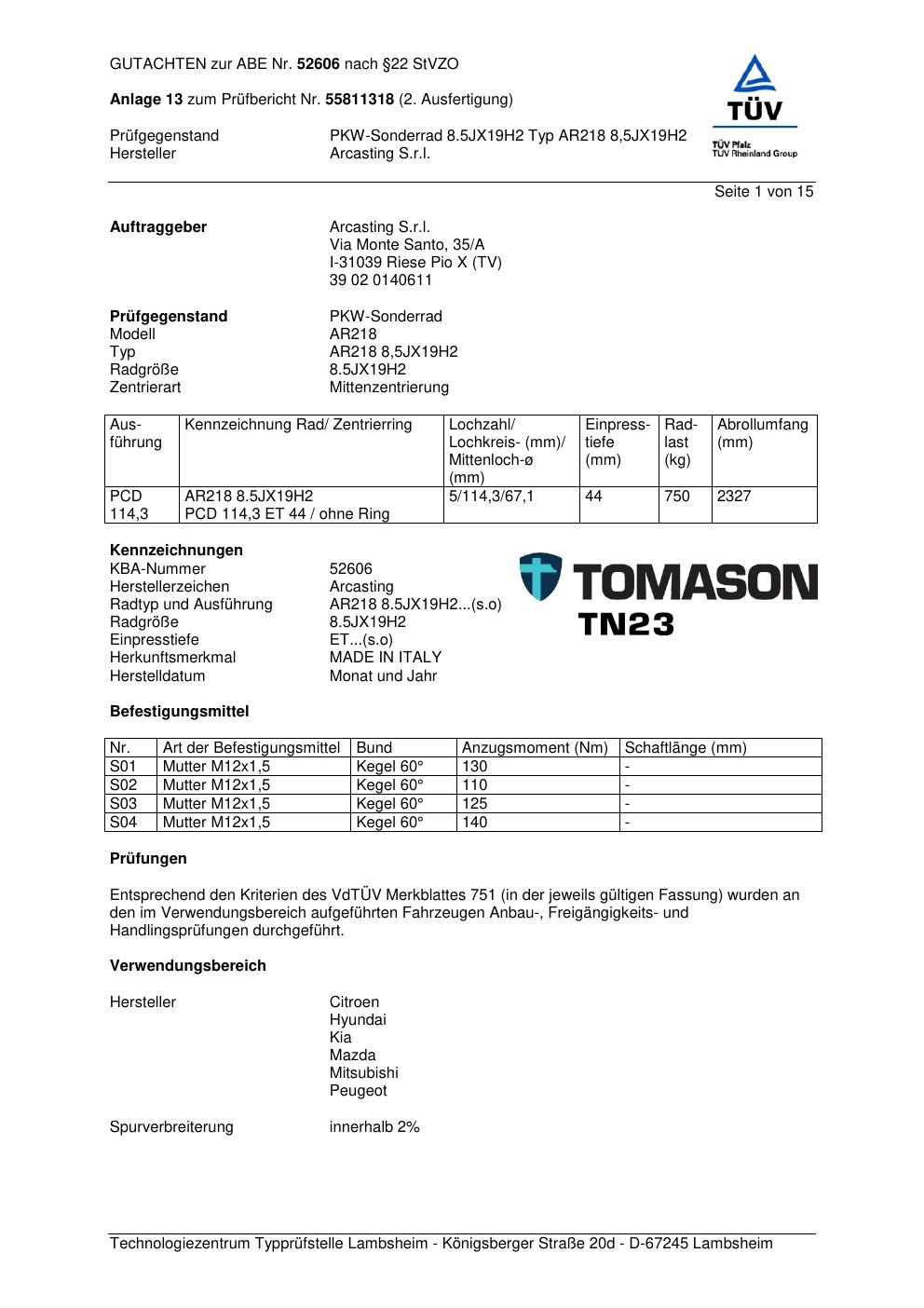 Dieses Gutachten (abe) bezieht sich auf die Alufelge Arcasting AR218 8 in der Ausführung ET 0, Mittenloch 0 mm (KBA 52606). Im PDF findest du typischerweise zulässige Reifengrößen, Auflagen/Anbauhinweise und – je nach Dokument – Hinweise zur Eintragung.