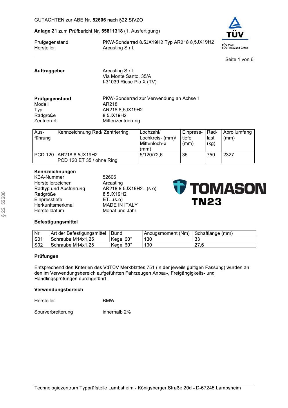 Dieses Gutachten (abe) bezieht sich auf die Alufelge Arcasting AR218 in der Ausführung ET 0, Mittenloch 0 mm (KBA 52606). Im PDF findest du typischerweise zulässige Reifengrößen, Auflagen/Anbauhinweise und – je nach Dokument – Hinweise zur Eintragung.