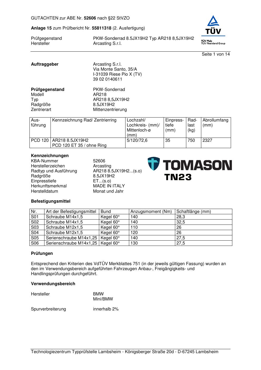 Dieses Gutachten (abe) bezieht sich auf die Alufelge Arcasting AR218 in der Ausführung ET 0, Mittenloch 0 mm (KBA 52606). Im PDF findest du typischerweise zulässige Reifengrößen, Auflagen/Anbauhinweise und – je nach Dokument – Hinweise zur Eintragung.
