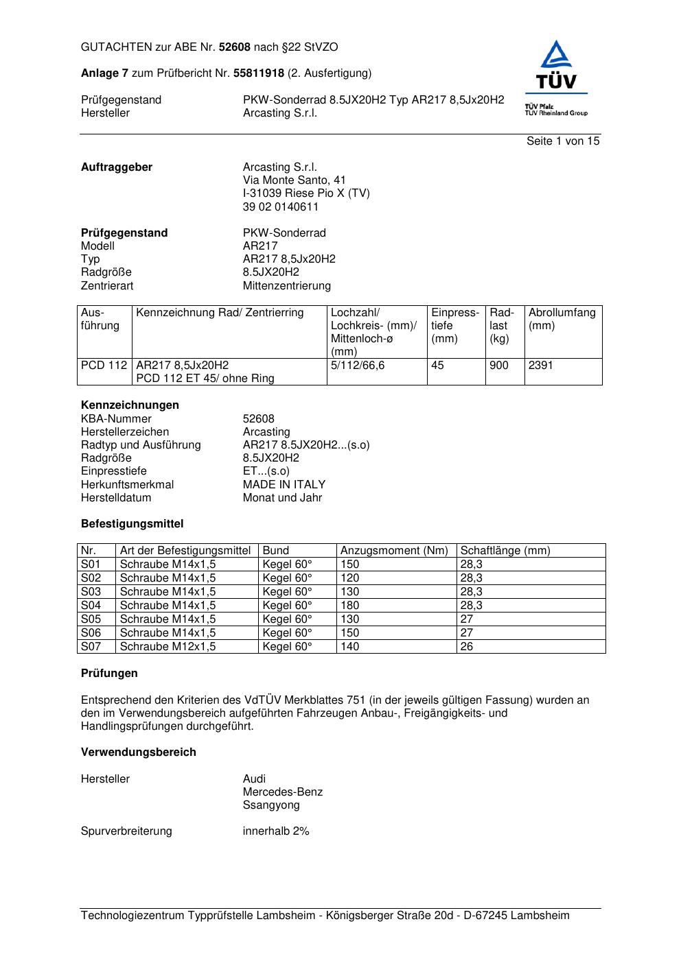 Dieses Gutachten (abe) bezieht sich auf die Alufelge Arcasting AR217 in der Ausführung ET 0, Mittenloch 0 mm (KBA 52608). Im PDF findest du typischerweise zulässige Reifengrößen, Auflagen/Anbauhinweise und – je nach Dokument – Hinweise zur Eintragung.