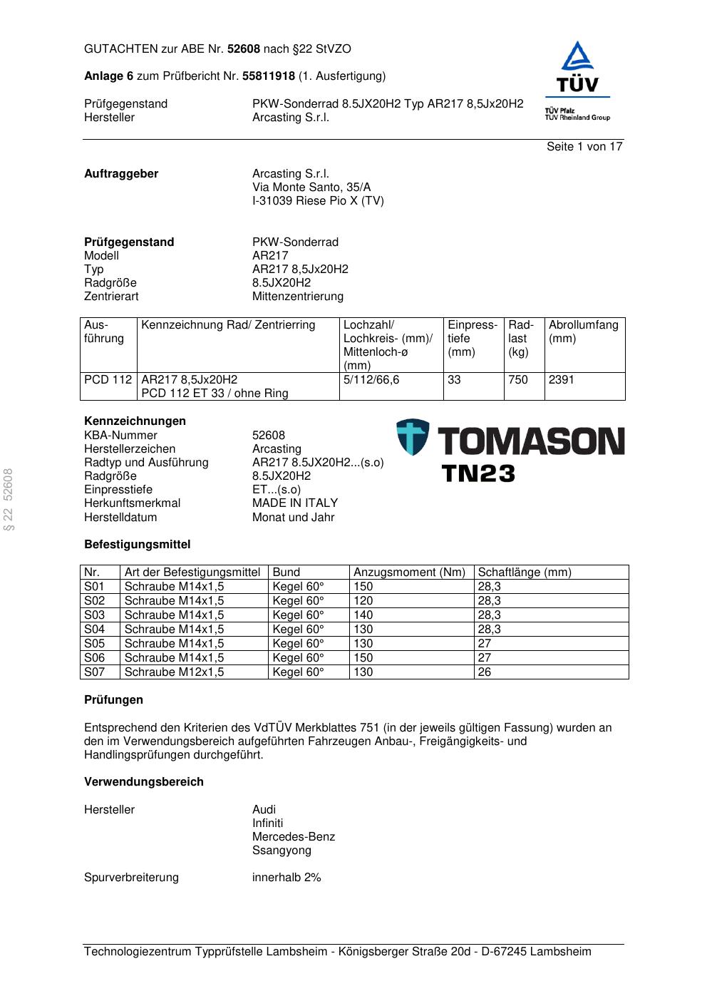 Dieses Gutachten (abe) bezieht sich auf die Alufelge Arcasting AR217 in der Ausführung ET 0, Mittenloch 0 mm (KBA 52608). Im PDF findest du typischerweise zulässige Reifengrößen, Auflagen/Anbauhinweise und – je nach Dokument – Hinweise zur Eintragung.