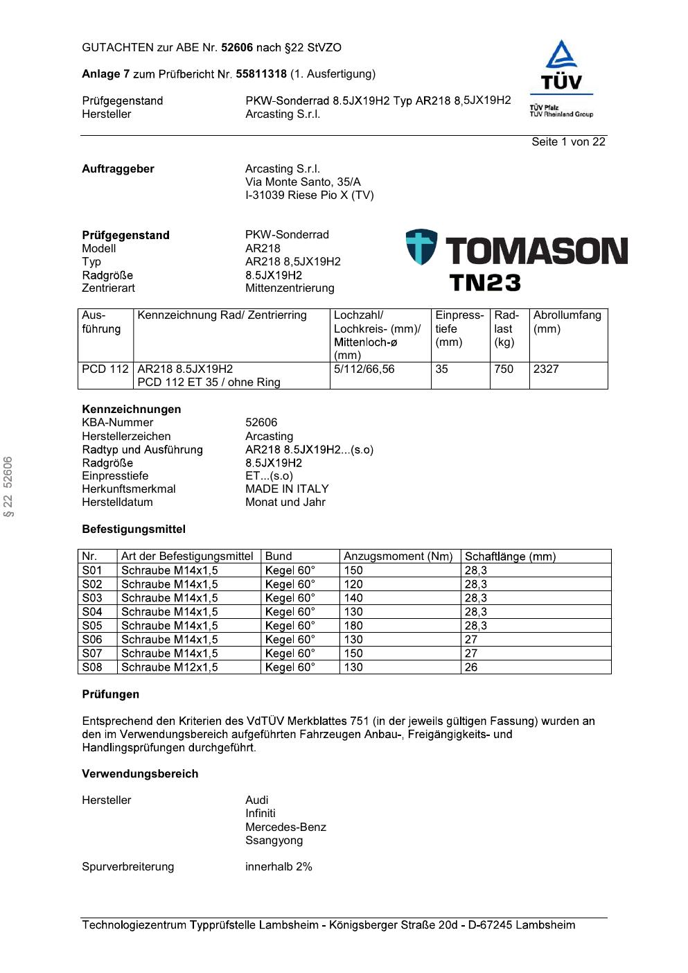 Dieses Gutachten (abe) bezieht sich auf die Alufelge Arcasting AR218 8 in der Ausführung ET 0, Mittenloch 0 mm (KBA 52606). Im PDF findest du typischerweise zulässige Reifengrößen, Auflagen/Anbauhinweise und – je nach Dokument – Hinweise zur Eintragung.
