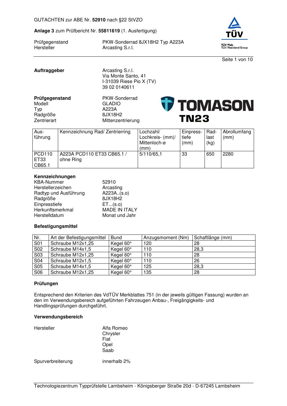 Dieses Gutachten (abe) bezieht sich auf die Alufelge Arcasting A223A in der Ausführung ET 0, Mittenloch 0 mm (KBA 52910). Im PDF findest du typischerweise zulässige Reifengrößen, Auflagen/Anbauhinweise und – je nach Dokument – Hinweise zur Eintragung.