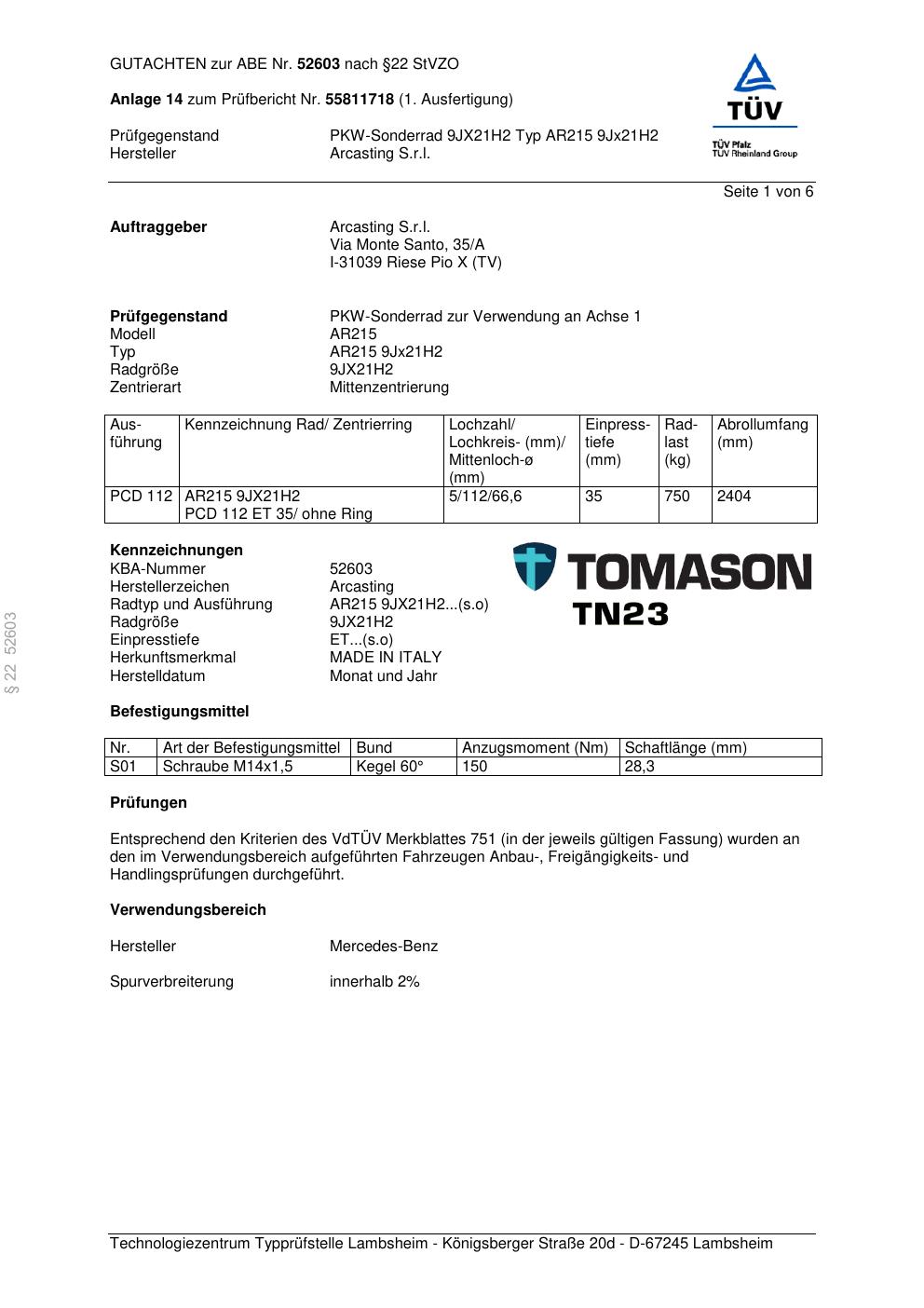 Dieses Gutachten (abe) bezieht sich auf die Alufelge Arcasting AR215 in der Ausführung ET 0, Mittenloch 0 mm (KBA 52603). Im PDF findest du typischerweise zulässige Reifengrößen, Auflagen/Anbauhinweise und – je nach Dokument – Hinweise zur Eintragung.