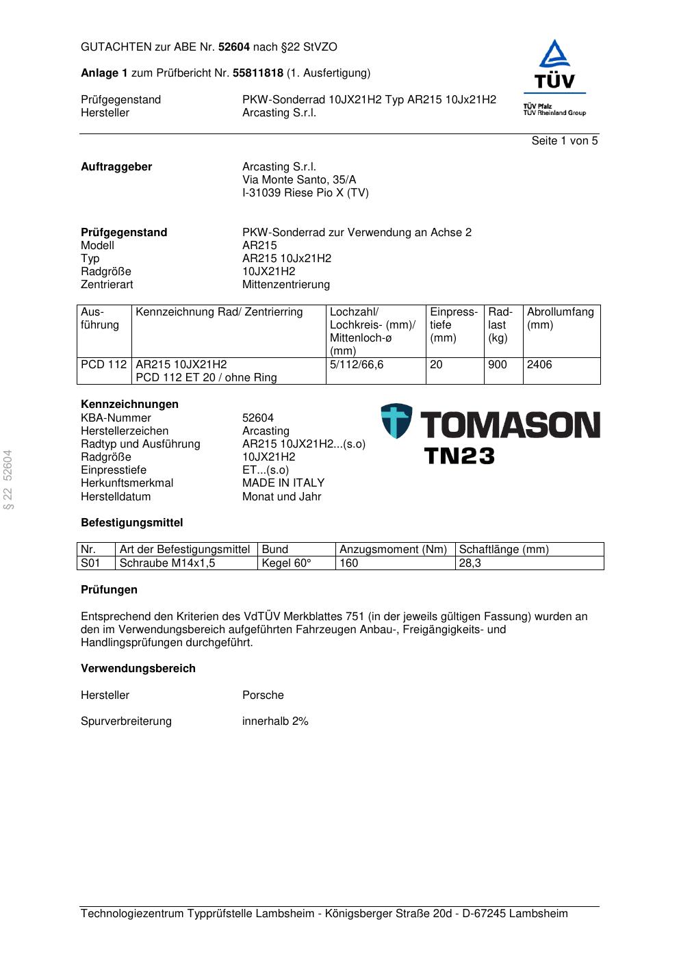 Dieses Gutachten (abe) bezieht sich auf die Alufelge Arcasting AR215 in der Ausführung ET 0, Mittenloch 0 mm (KBA 52604). Im PDF findest du typischerweise zulässige Reifengrößen, Auflagen/Anbauhinweise und – je nach Dokument – Hinweise zur Eintragung.