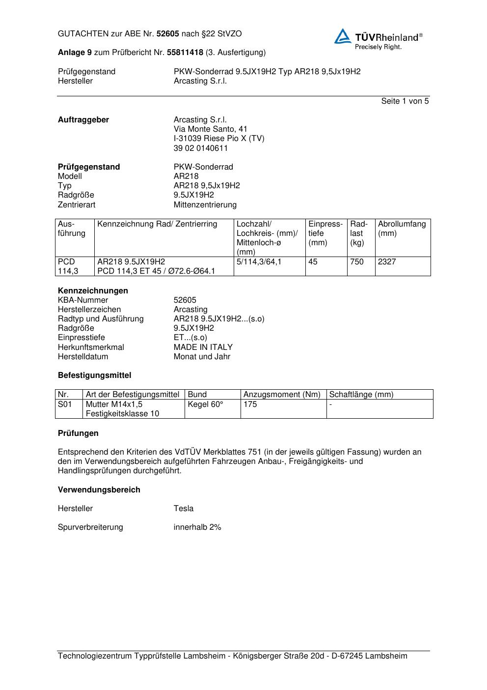 Dieses Gutachten (abe) bezieht sich auf die Alufelge Arcasting AR218 9 in der Ausführung ET 0, Mittenloch 0 mm (KBA 52605). Im PDF findest du typischerweise zulässige Reifengrößen, Auflagen/Anbauhinweise und – je nach Dokument – Hinweise zur Eintragung.