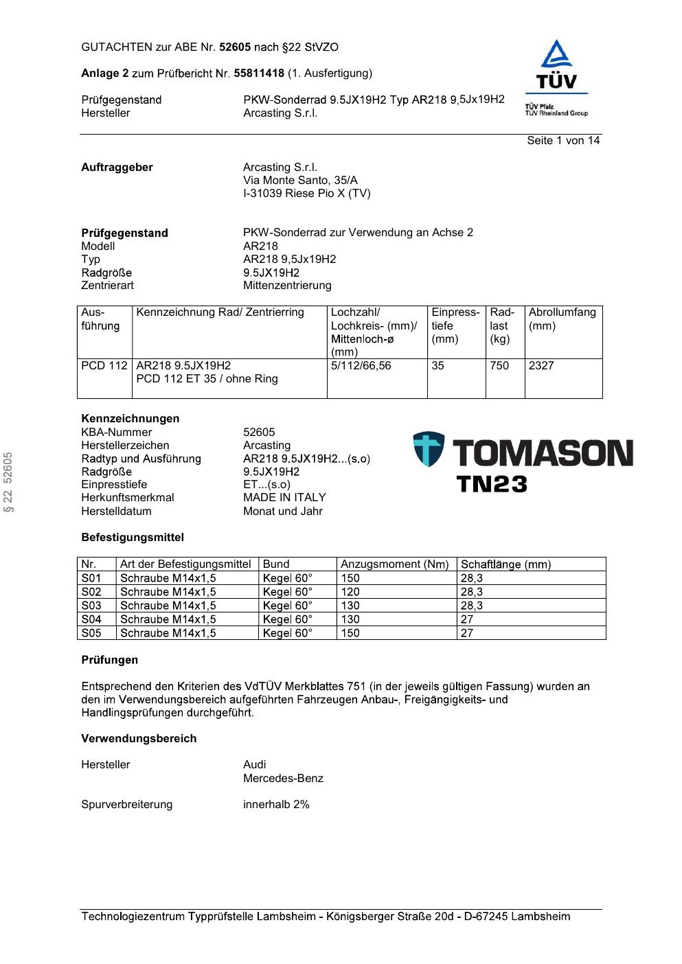 Dieses Gutachten (abe) bezieht sich auf die Alufelge Arcasting AR218 in der Ausführung ET 0, Mittenloch 0 mm (KBA 52605). Im PDF findest du typischerweise zulässige Reifengrößen, Auflagen/Anbauhinweise und – je nach Dokument – Hinweise zur Eintragung.
