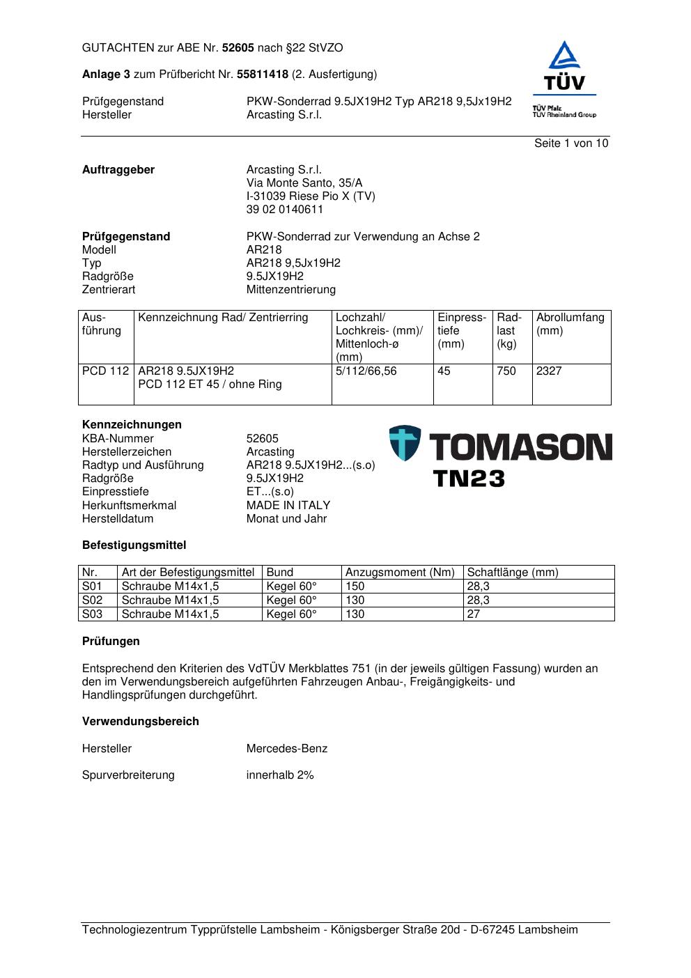 Dieses Gutachten (abe) bezieht sich auf die Alufelge Arcasting AR218 in der Ausführung ET 0, Mittenloch 0 mm (KBA 52605). Im PDF findest du typischerweise zulässige Reifengrößen, Auflagen/Anbauhinweise und – je nach Dokument – Hinweise zur Eintragung.