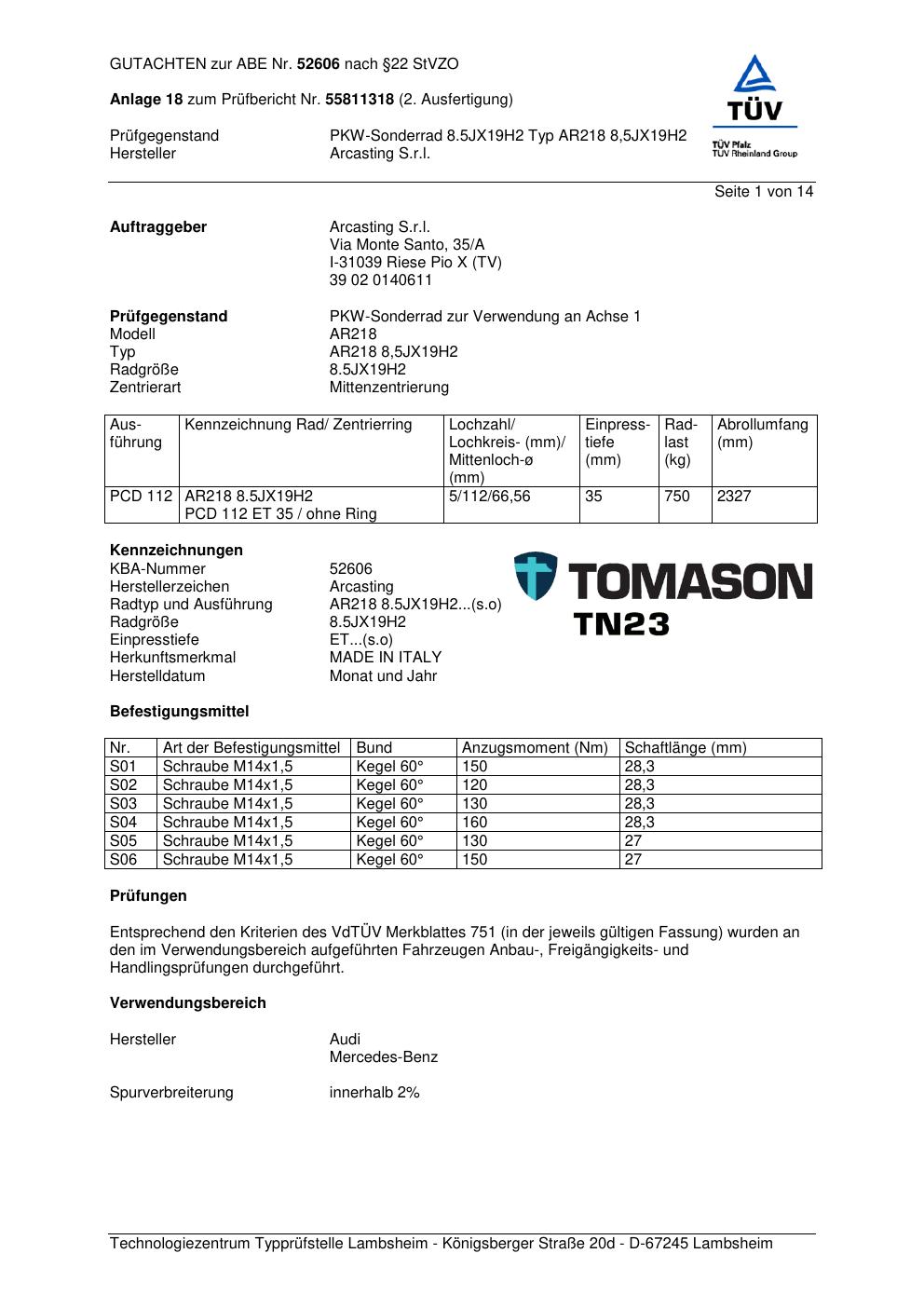 Dieses Gutachten (abe) bezieht sich auf die Alufelge Arcasting AR218 in der Ausführung ET 0, Mittenloch 0 mm (KBA 52606). Im PDF findest du typischerweise zulässige Reifengrößen, Auflagen/Anbauhinweise und – je nach Dokument – Hinweise zur Eintragung.