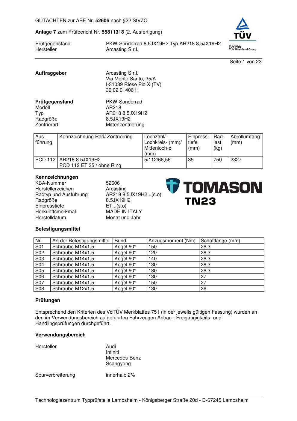 Dieses Gutachten (abe) bezieht sich auf die Alufelge Arcasting AR218 in der Ausführung ET 0, Mittenloch 0 mm (KBA 52606). Im PDF findest du typischerweise zulässige Reifengrößen, Auflagen/Anbauhinweise und – je nach Dokument – Hinweise zur Eintragung.