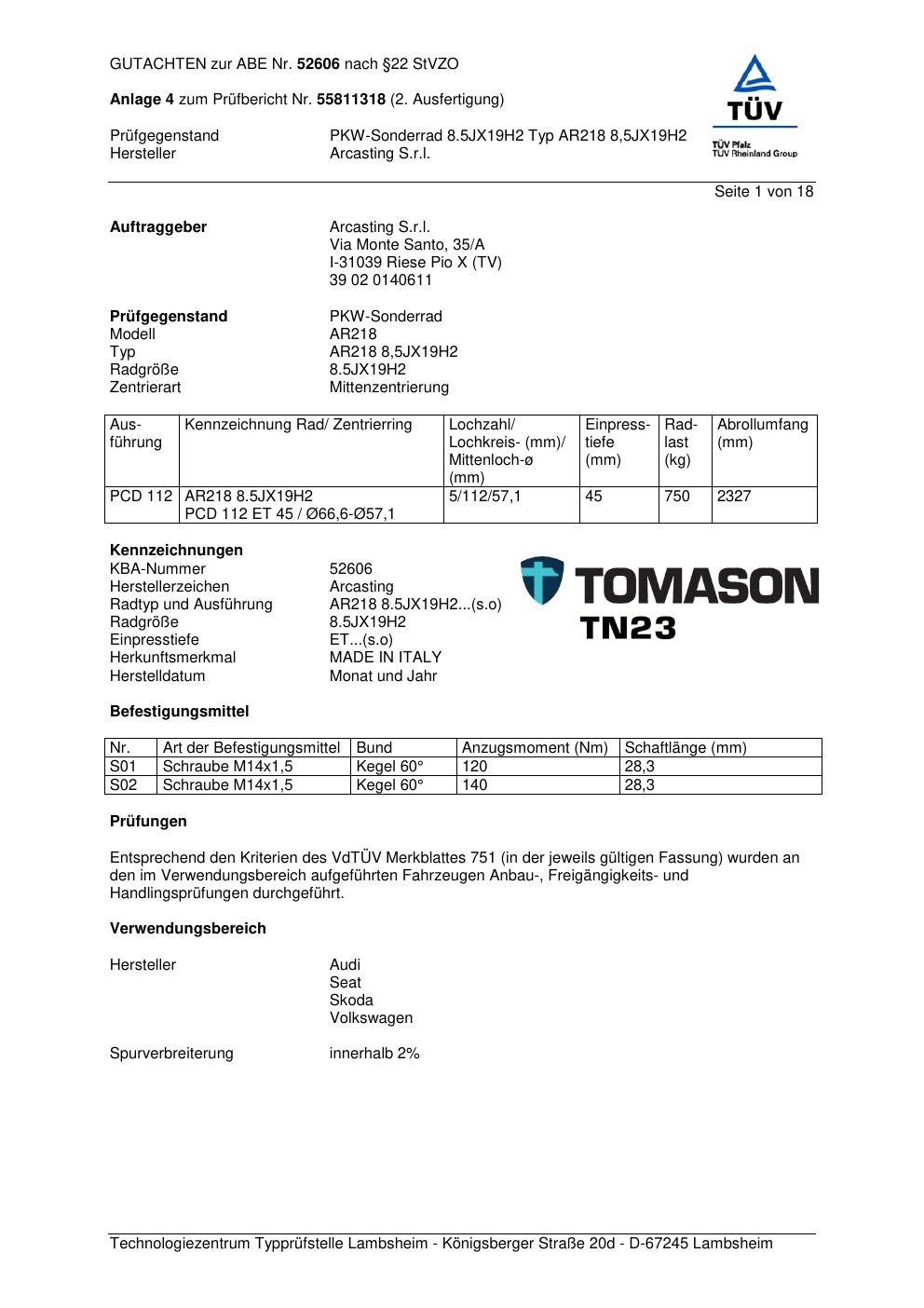 Dieses Gutachten (abe) bezieht sich auf die Alufelge Arcasting AR218 in der Ausführung ET 0, Mittenloch 0 mm (KBA 52606). Im PDF findest du typischerweise zulässige Reifengrößen, Auflagen/Anbauhinweise und – je nach Dokument – Hinweise zur Eintragung.