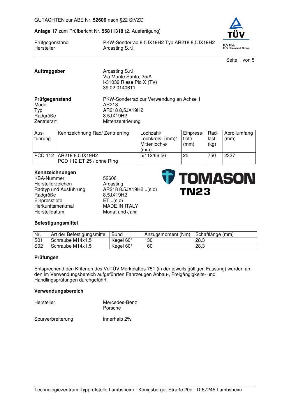 Dieses Gutachten (abe) bezieht sich auf die Alufelge Arcasting AR218 in der Ausführung ET 0, Mittenloch 0 mm (KBA 52606). Im PDF findest du typischerweise zulässige Reifengrößen, Auflagen/Anbauhinweise und – je nach Dokument – Hinweise zur Eintragung.