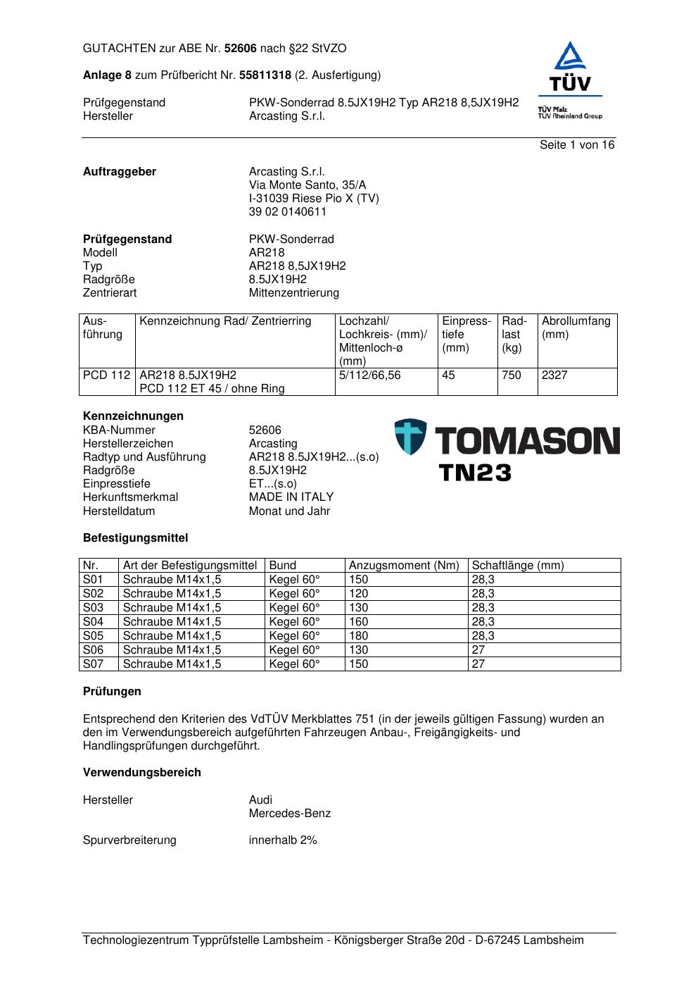Dieses Gutachten (abe) bezieht sich auf die Alufelge Arcasting AR218 8 in der Ausführung ET 0, Mittenloch 0 mm (KBA 52606). Im PDF findest du typischerweise zulässige Reifengrößen, Auflagen/Anbauhinweise und – je nach Dokument – Hinweise zur Eintragung.