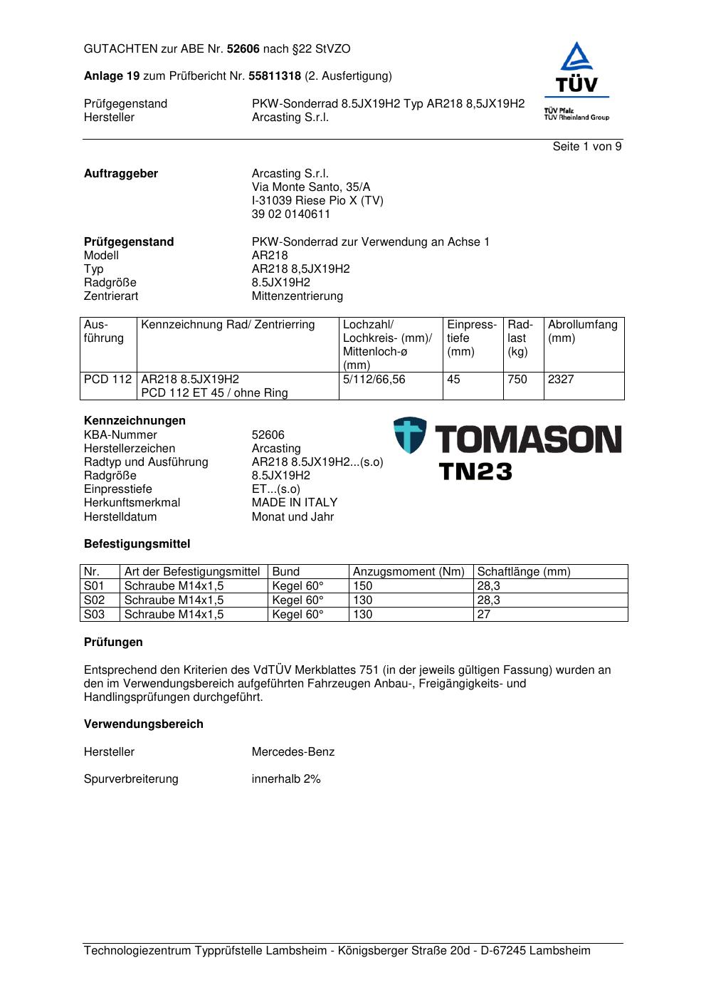 Dieses Gutachten (abe) bezieht sich auf die Alufelge Arcasting AR218 in der Ausführung ET 0, Mittenloch 0 mm (KBA 52606). Im PDF findest du typischerweise zulässige Reifengrößen, Auflagen/Anbauhinweise und – je nach Dokument – Hinweise zur Eintragung.
