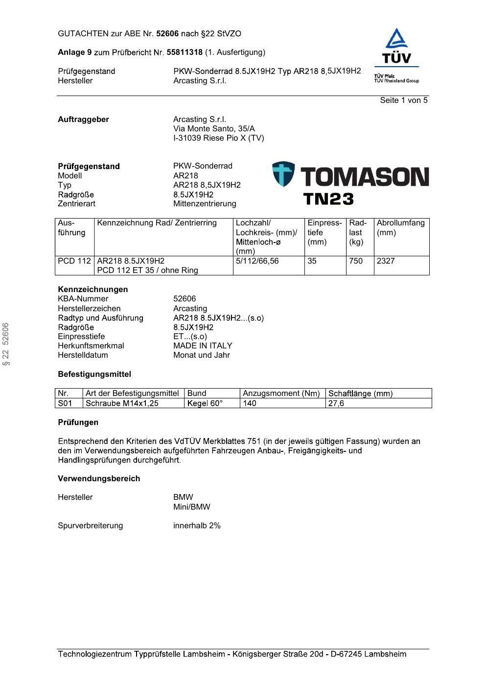 Dieses Gutachten (abe) bezieht sich auf die Alufelge Arcasting AR218 in der Ausführung ET 0, Mittenloch 0 mm (KBA 52606). Im PDF findest du typischerweise zulässige Reifengrößen, Auflagen/Anbauhinweise und – je nach Dokument – Hinweise zur Eintragung.