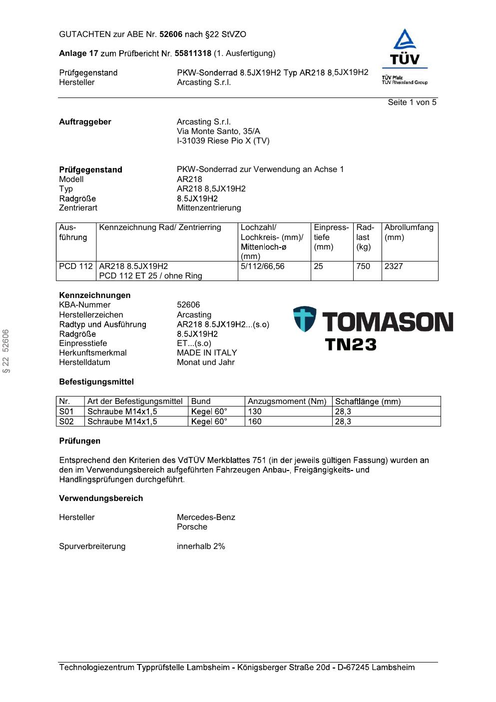 Dieses Gutachten (abe) bezieht sich auf die Alufelge Arcasting AR218 8 in der Ausführung ET 0, Mittenloch 0 mm (KBA 52606). Im PDF findest du typischerweise zulässige Reifengrößen, Auflagen/Anbauhinweise und – je nach Dokument – Hinweise zur Eintragung.