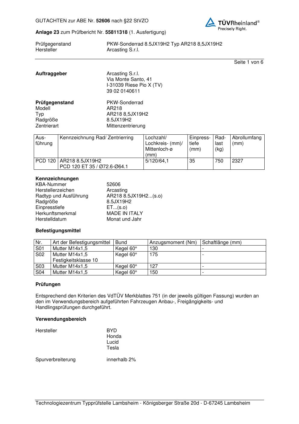 Dieses Gutachten (abe) bezieht sich auf die Alufelge Arcasting AR218 in der Ausführung ET 0, Mittenloch 0 mm (KBA 52606). Im PDF findest du typischerweise zulässige Reifengrößen, Auflagen/Anbauhinweise und – je nach Dokument – Hinweise zur Eintragung.