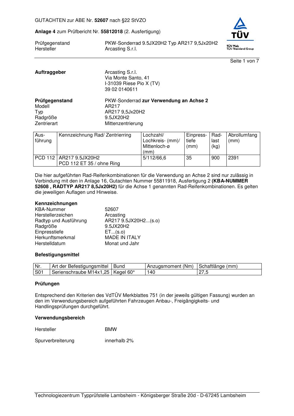 Dieses Gutachten (abe) bezieht sich auf die Alufelge Arcasting AR217 in der Ausführung ET 0, Mittenloch 0 mm (KBA 52607). Im PDF findest du typischerweise zulässige Reifengrößen, Auflagen/Anbauhinweise und – je nach Dokument – Hinweise zur Eintragung.