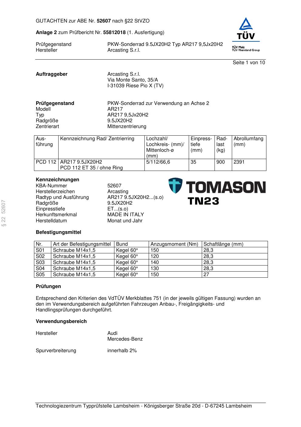 Dieses Gutachten (abe) bezieht sich auf die Alufelge Arcasting AR217 in der Ausführung ET 0, Mittenloch 0 mm (KBA 52607). Im PDF findest du typischerweise zulässige Reifengrößen, Auflagen/Anbauhinweise und – je nach Dokument – Hinweise zur Eintragung.
