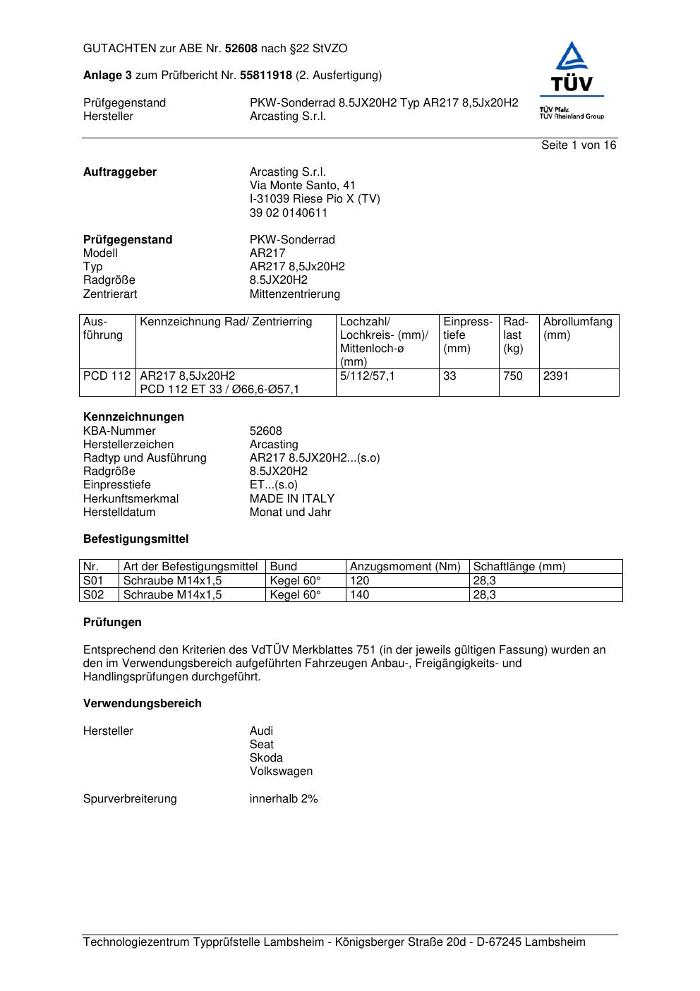 Dieses Gutachten (abe) bezieht sich auf die Alufelge Arcasting AR217 in der Ausführung ET 0, Mittenloch 0 mm (KBA 52608). Im PDF findest du typischerweise zulässige Reifengrößen, Auflagen/Anbauhinweise und – je nach Dokument – Hinweise zur Eintragung.