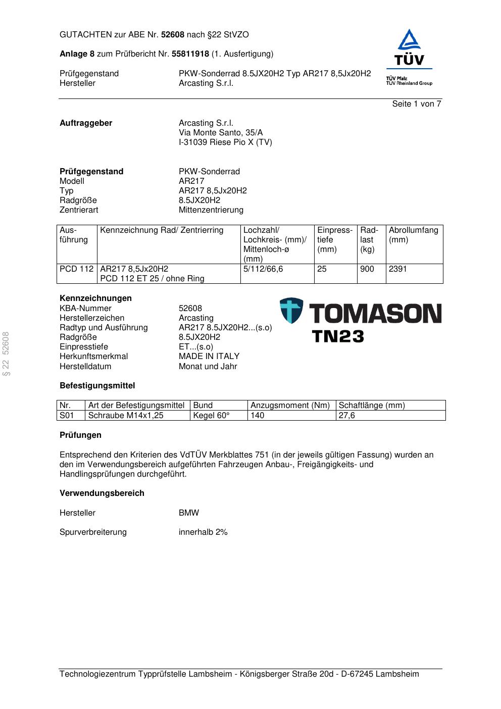 Dieses Gutachten (abe) bezieht sich auf die Alufelge Arcasting AR217 in der Ausführung ET 0, Mittenloch 0 mm (KBA 52608). Im PDF findest du typischerweise zulässige Reifengrößen, Auflagen/Anbauhinweise und – je nach Dokument – Hinweise zur Eintragung.
