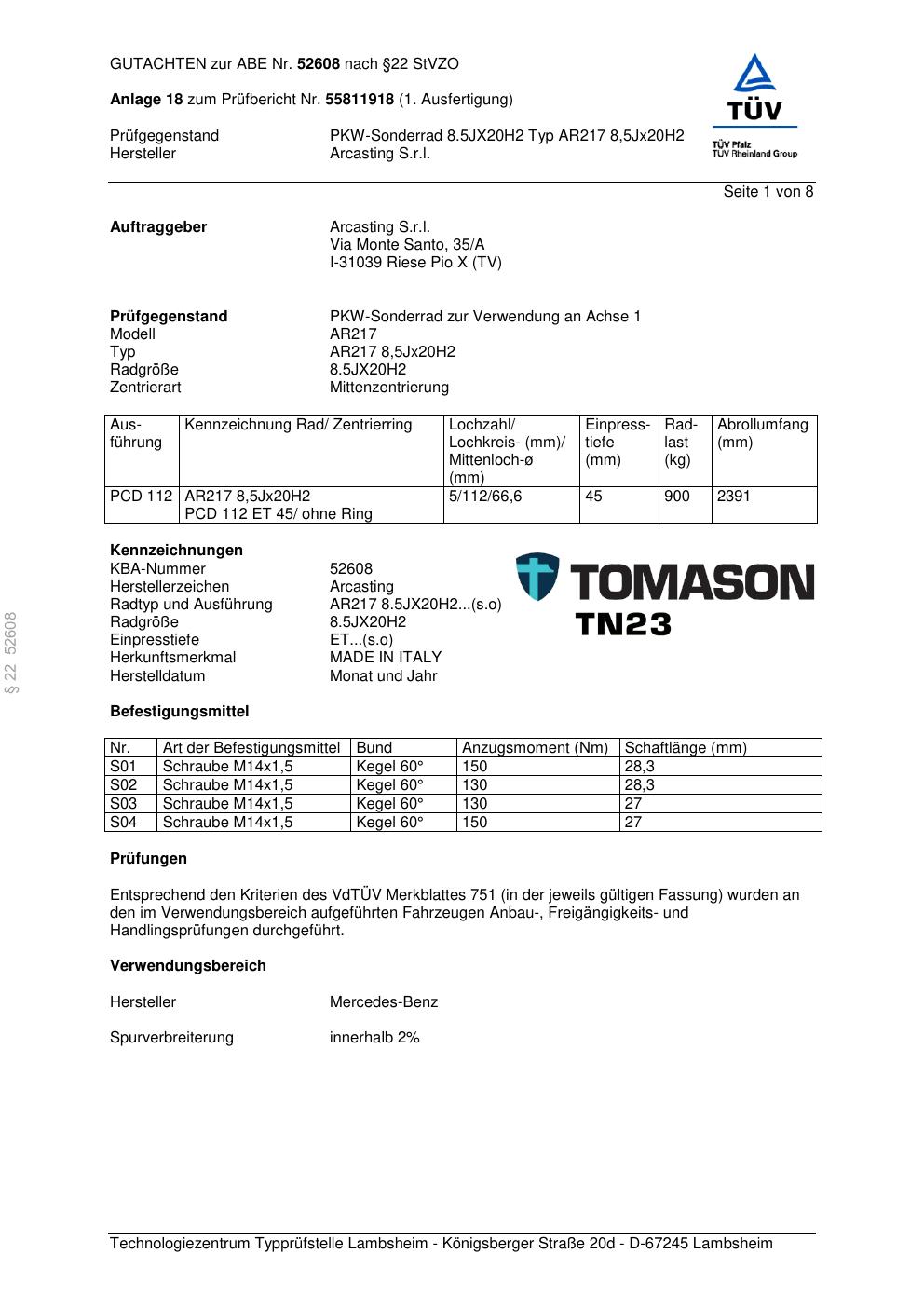 Dieses Gutachten (abe) bezieht sich auf die Alufelge Arcasting AR217 in der Ausführung ET 0, Mittenloch 0 mm (KBA 52608). Im PDF findest du typischerweise zulässige Reifengrößen, Auflagen/Anbauhinweise und – je nach Dokument – Hinweise zur Eintragung.