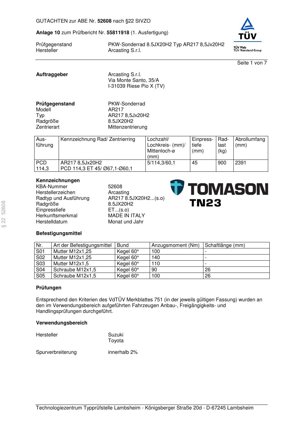 Dieses Gutachten (abe) bezieht sich auf die Alufelge Arcasting AR217 in der Ausführung ET 0, Mittenloch 0 mm (KBA 52608). Im PDF findest du typischerweise zulässige Reifengrößen, Auflagen/Anbauhinweise und – je nach Dokument – Hinweise zur Eintragung.
