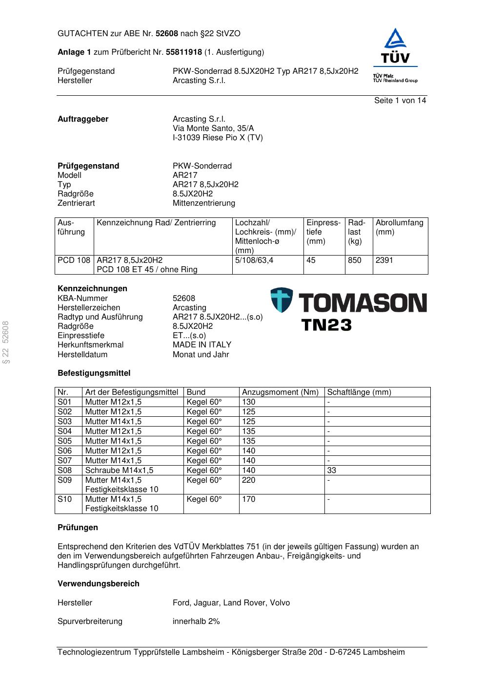 Dieses Gutachten (abe) bezieht sich auf die Alufelge Arcasting AR217 in der Ausführung ET 0, Mittenloch 0 mm (KBA 52608). Im PDF findest du typischerweise zulässige Reifengrößen, Auflagen/Anbauhinweise und – je nach Dokument – Hinweise zur Eintragung.