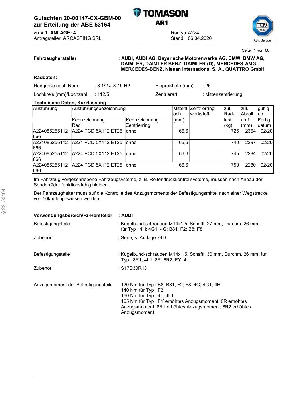 Dieses Gutachten (abe) bezieht sich auf die Alufelge Arcasting A224 in der Ausführung ET 0, Mittenloch 0 mm (KBA 53164). Im PDF findest du typischerweise zulässige Reifengrößen, Auflagen/Anbauhinweise und – je nach Dokument – Hinweise zur Eintragung.