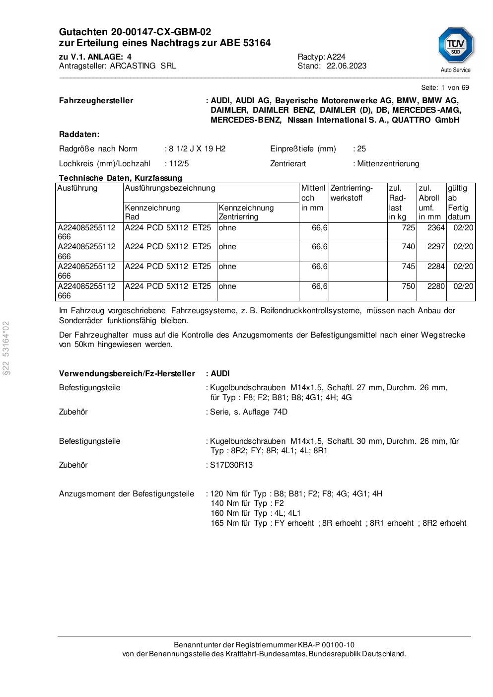Dieses Gutachten (abe) bezieht sich auf die Alufelge Arcasting A224 in der Ausführung ET 0, Mittenloch 0 mm (KBA 53164). Im PDF findest du typischerweise zulässige Reifengrößen, Auflagen/Anbauhinweise und – je nach Dokument – Hinweise zur Eintragung.