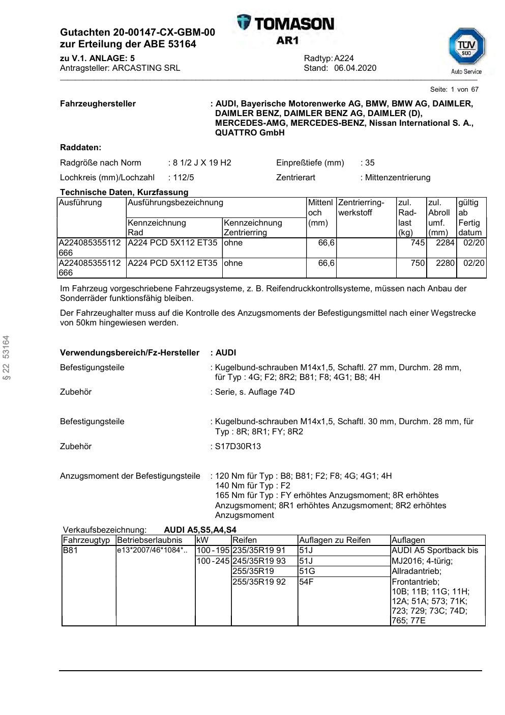 Dieses Gutachten (abe) bezieht sich auf die Alufelge Arcasting A224 in der Ausführung ET 0, Mittenloch 0 mm (KBA 53164). Im PDF findest du typischerweise zulässige Reifengrößen, Auflagen/Anbauhinweise und – je nach Dokument – Hinweise zur Eintragung.
