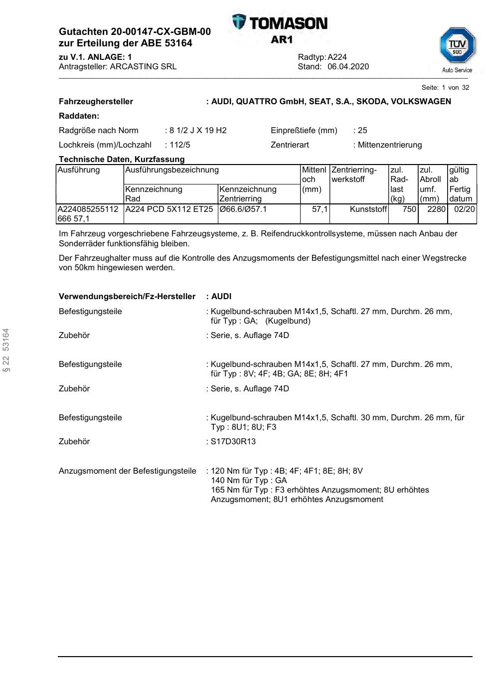Dieses Gutachten (abe) bezieht sich auf die Alufelge Arcasting A224 in der Ausführung ET 0, Mittenloch 0 mm (KBA 53164). Im PDF findest du typischerweise zulässige Reifengrößen, Auflagen/Anbauhinweise und – je nach Dokument – Hinweise zur Eintragung.