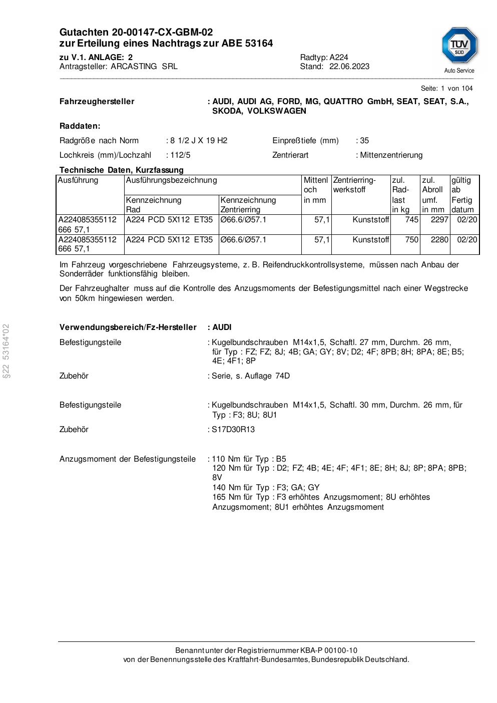 Dieses Gutachten (abe) bezieht sich auf die Alufelge Arcasting A224 in der Ausführung ET 0, Mittenloch 0 mm (KBA 53164). Im PDF findest du typischerweise zulässige Reifengrößen, Auflagen/Anbauhinweise und – je nach Dokument – Hinweise zur Eintragung.