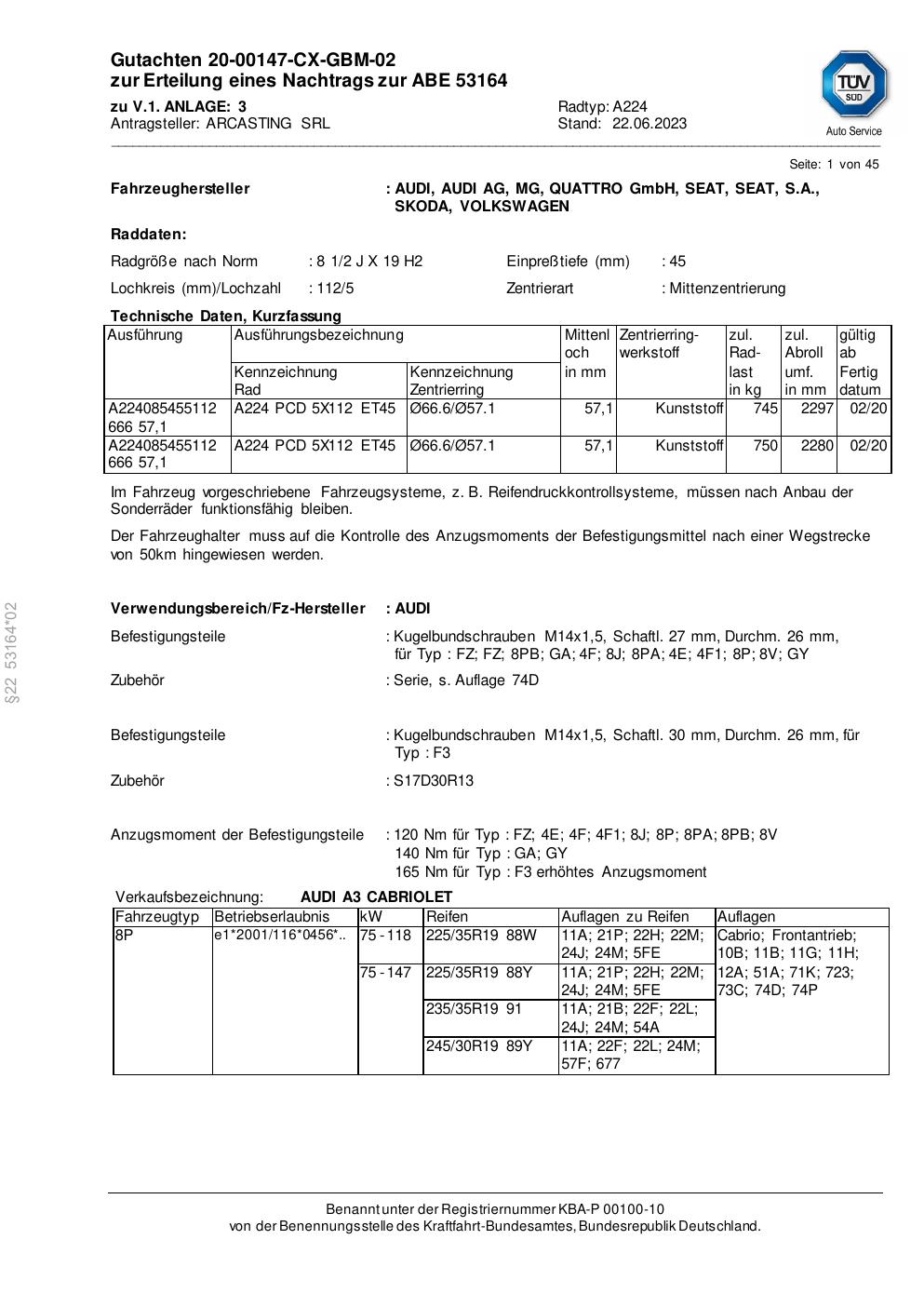 Dieses Gutachten (abe) bezieht sich auf die Alufelge Arcasting A224 in der Ausführung ET 0, Mittenloch 0 mm (KBA 53164). Im PDF findest du typischerweise zulässige Reifengrößen, Auflagen/Anbauhinweise und – je nach Dokument – Hinweise zur Eintragung.