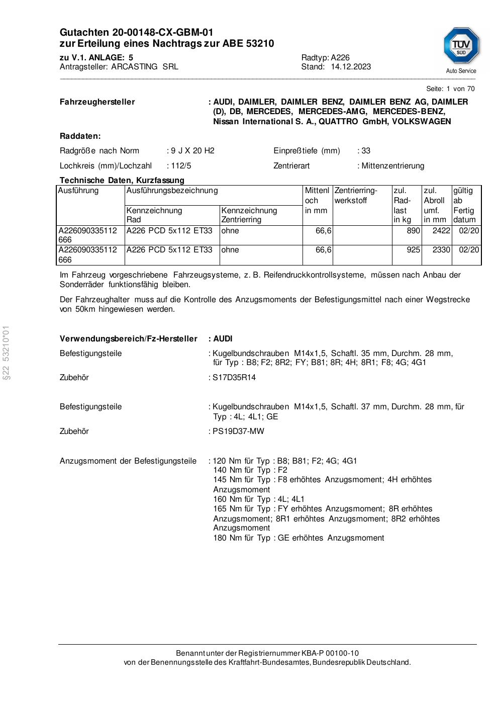 Dieses Gutachten (abe) bezieht sich auf die Alufelge Arcasting A226 in der Ausführung ET 0, Mittenloch 0 mm (KBA 53210). Im PDF findest du typischerweise zulässige Reifengrößen, Auflagen/Anbauhinweise und – je nach Dokument – Hinweise zur Eintragung.