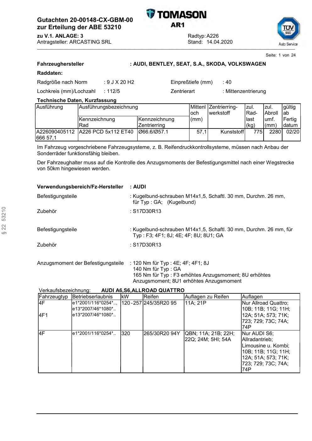 Dieses Gutachten (abe) bezieht sich auf die Alufelge ARCASTING SRL A226 in der Ausführung ET 0, Mittenloch 0 mm (KBA 53210). Im PDF findest du typischerweise zulässige Reifengrößen, Auflagen/Anbauhinweise und – je nach Dokument – Hinweise zur Eintragung.