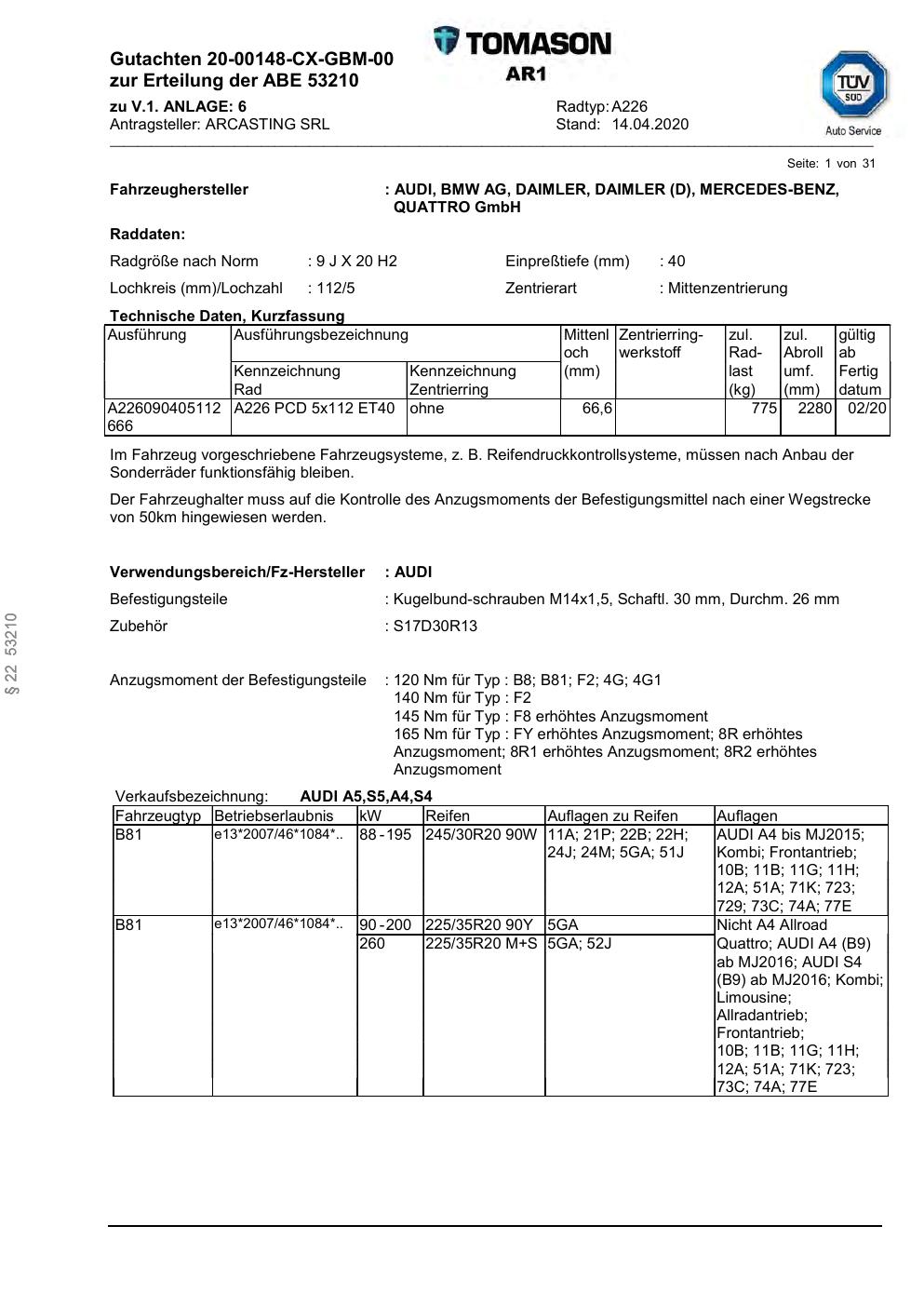Dieses Gutachten (abe) bezieht sich auf die Alufelge ARCASTING SRL A226 in der Ausführung ET 0, Mittenloch 0 mm (KBA 53210). Im PDF findest du typischerweise zulässige Reifengrößen, Auflagen/Anbauhinweise und – je nach Dokument – Hinweise zur Eintragung.