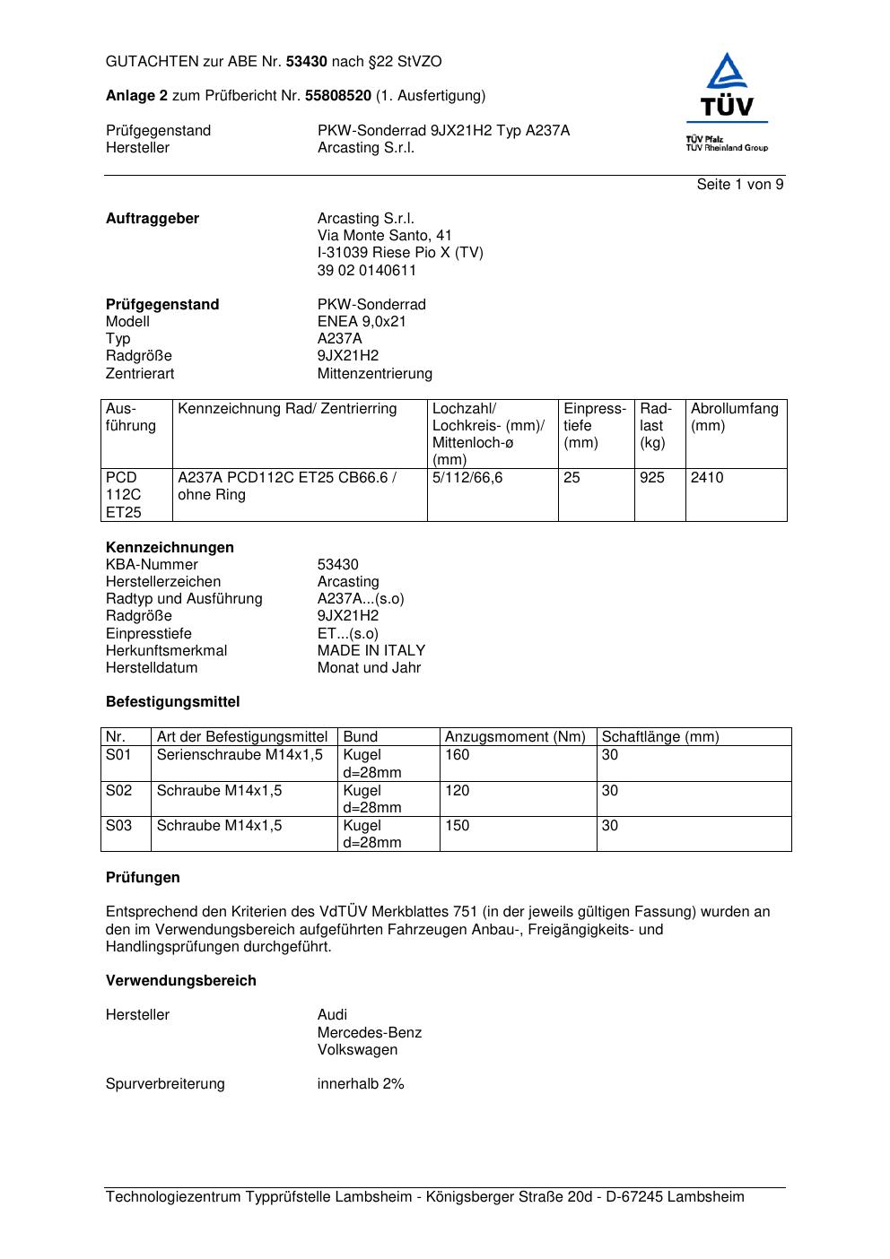 Dieses Gutachten (abe) bezieht sich auf die Alufelge Arcasting A237A in der Ausführung ET 0, Mittenloch 0 mm (KBA 53430). Im PDF findest du typischerweise zulässige Reifengrößen, Auflagen/Anbauhinweise und – je nach Dokument – Hinweise zur Eintragung.