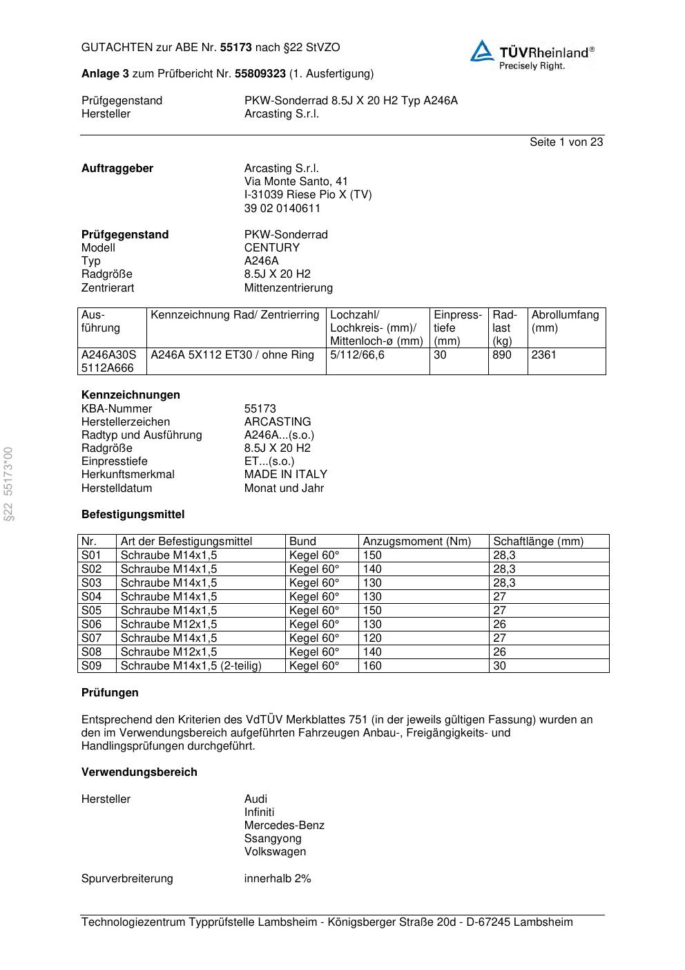 Dieses Gutachten (abe) bezieht sich auf die Alufelge Arcasting S.r.l. A246A in der Ausführung ET 0, Mittenloch 0 mm (KBA 55173). Im PDF findest du typischerweise zulässige Reifengrößen, Auflagen/Anbauhinweise und – je nach Dokument – Hinweise zur Eintragung.