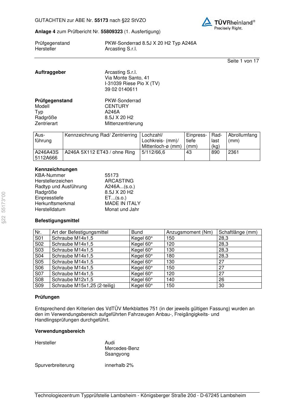 Felgengutachten / abe für Alufelgen Arcasting S.r.l. A246A (ET 0, Mittenloch 0 mm) mit KBA 55173 (Zertifikatsnummer 55173). Hier kostenlos als PDF herunterladen. Der Download-Link ist 24 Stunden gültig und kann bis zu zwei Mal verwendet werden.