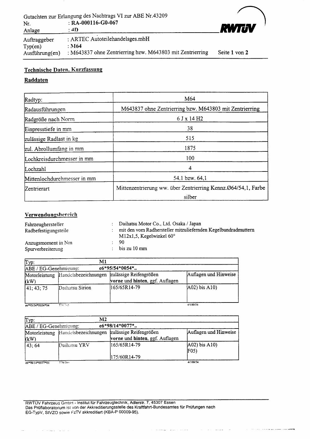 Dieses Gutachten (abe) bezieht sich auf die Alufelge ARTEC AutoteiIehande1sges.mbH M64 in der Ausführung ET 0, Mittenloch 0 mm (KBA 43209). Im PDF findest du typischerweise zulässige Reifengrößen, Auflagen/Anbauhinweise und – je nach Dokument – Hinweise zur Eintragung.