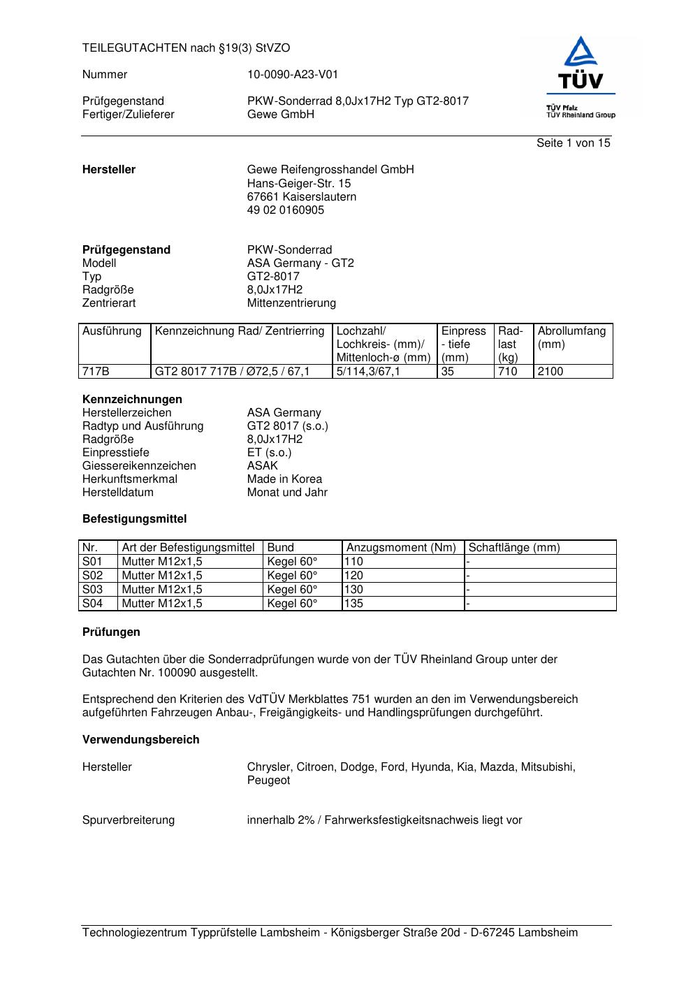 teilegutachten 10-0090-a23-v01 ASA Germany GT2-8017