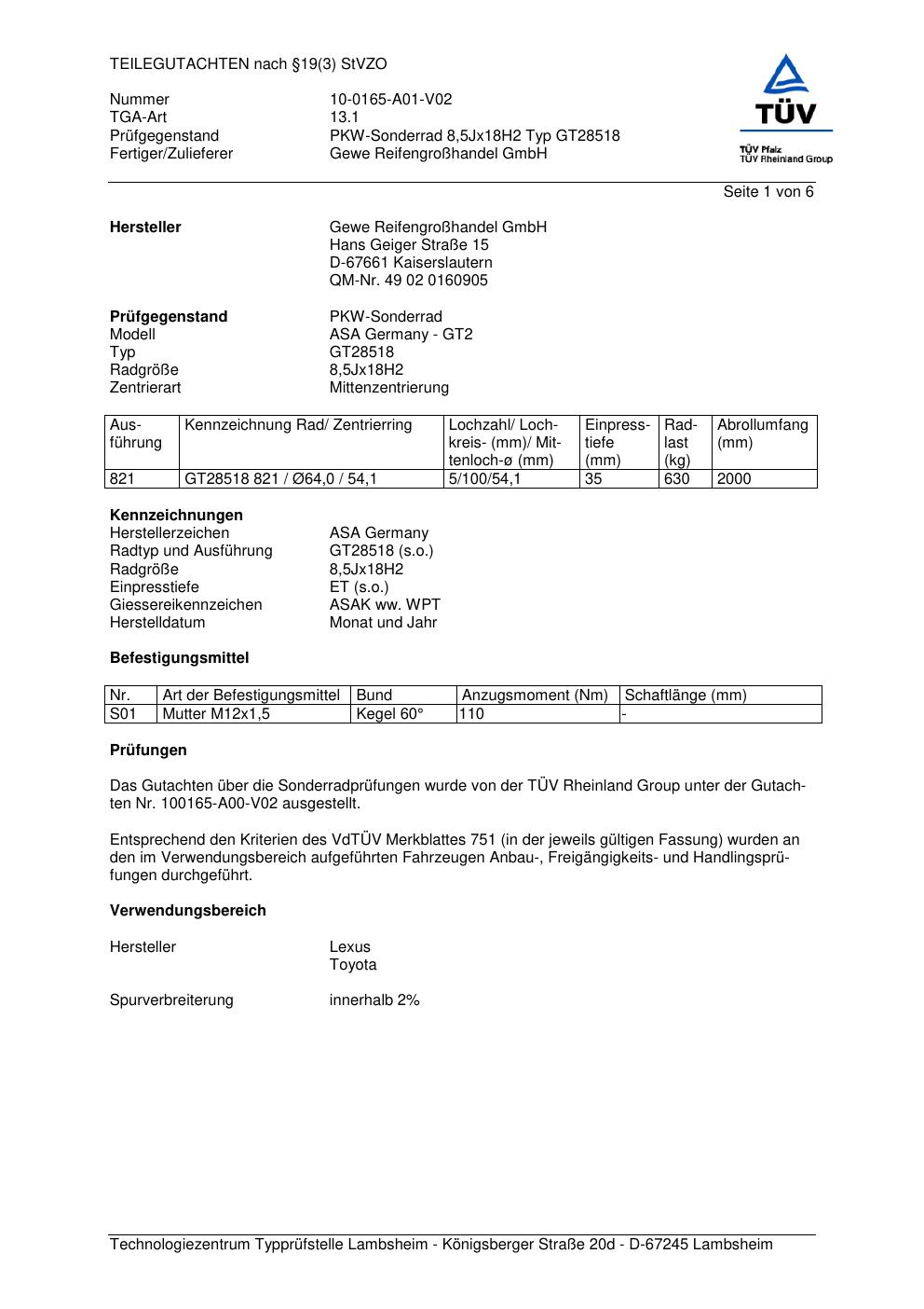 teilegutachten 10-0165-a01-v02 ASA Germany (Gewe Reifengroßhandel GmbH) GT2