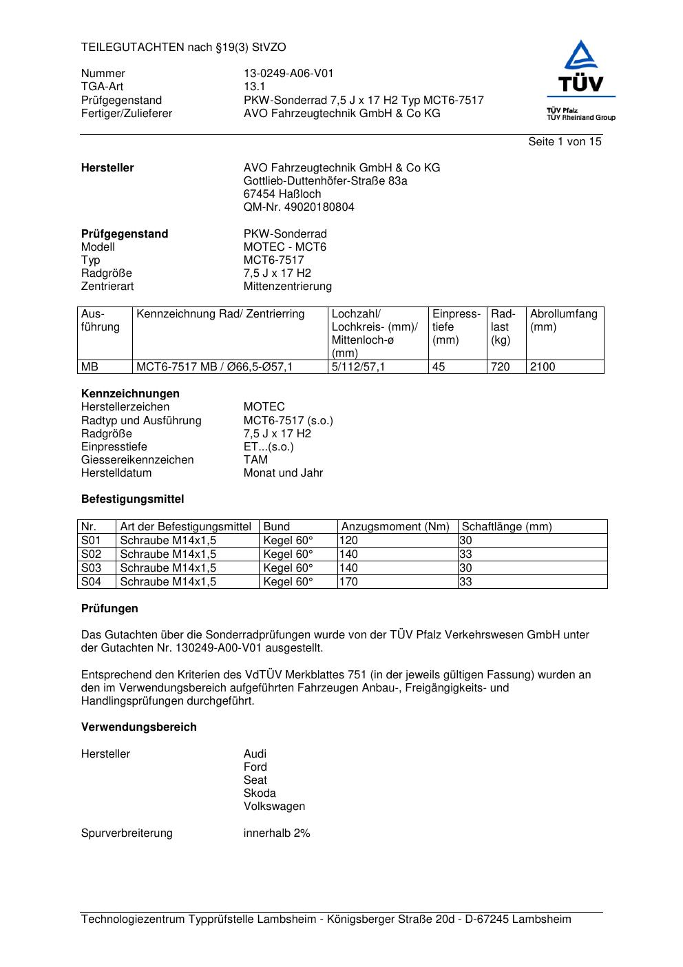 Felgengutachten / teilegutachten für Alufelgen AVO MCT6-7517 (ET 0, Mittenloch 0 mm) (Zertifikatsnummer 13-0249-a06-v01). Hier kostenlos als PDF herunterladen. Der Download-Link ist 24 Stunden gültig und kann bis zu zwei Mal verwendet werden.