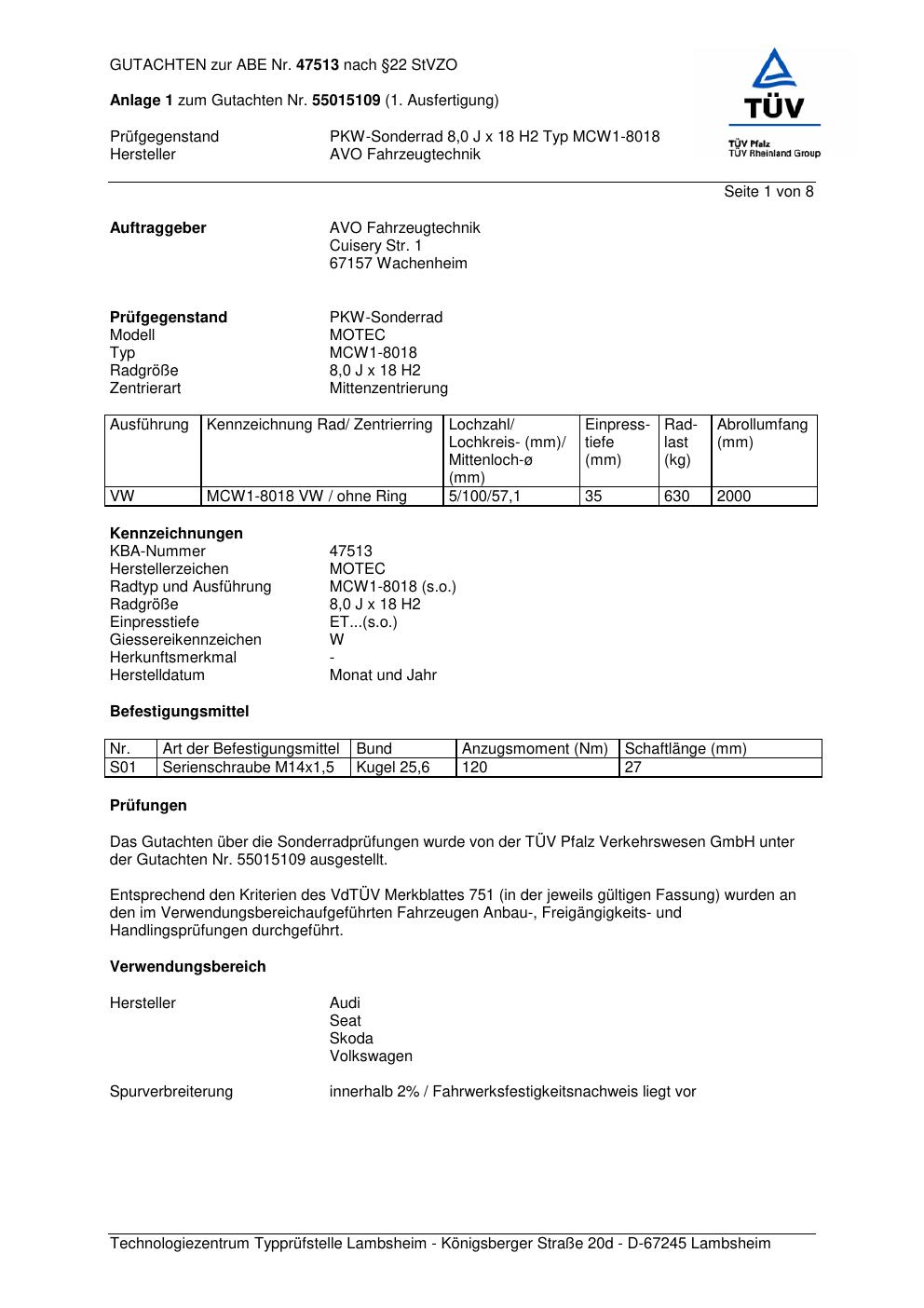 Dieses Gutachten (abe) bezieht sich auf die Alufelge AVO Fahrzeugtechnik MCW1-8018 in der Ausführung ET 0, Mittenloch 0 mm (KBA 47513). Im PDF findest du typischerweise zulässige Reifengrößen, Auflagen/Anbauhinweise und – je nach Dokument – Hinweise zur Eintragung.